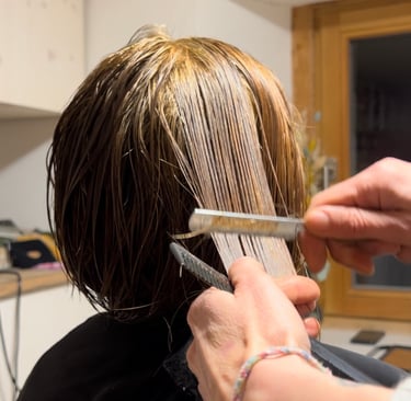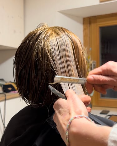 Ensuite on réalise une coupe de cheveux désirée à l'aide d'un coupe chou afin de créer 2 vibrations :