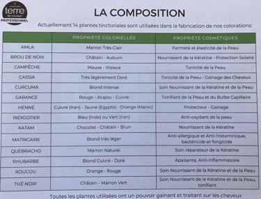 Ces colorations ne contiennent ni ammoniaque, ni peroxyde d'hydrogène, ni autres produits chimiques agressifs. Elles agissent en enveloppant le cheveu d'un film végétal, colorant ainsi la fibre capillaire de manière progressive et durable.